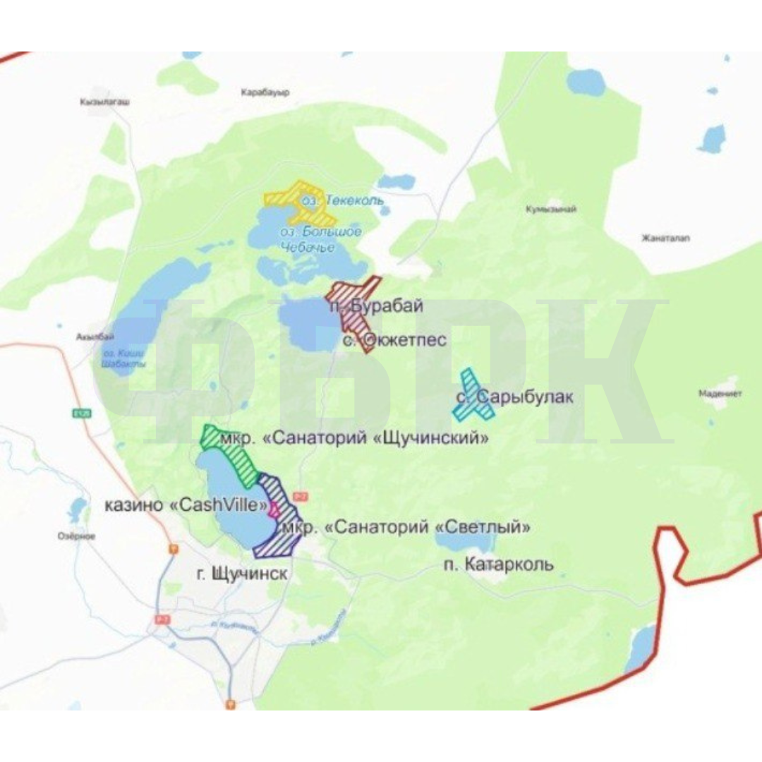 И вот здесь появляется интересная деталь, которая заставляет по-новому взглянуть на происходящее. В наш анонимный бот попало постановление акимата Акмолинской области от 23 сентября 2025 года. Документ определяет границы территорий для размещения казино, залов игровых автоматов, букмекерских контор и тотализаторов в Бурабайском районе. Причём зоны эти охватывают именно те места, где сейчас идёт изъятие земель: город Щучинск с его санаториями «Светлый» и «Щучинский», северо-западная часть озера Большое Чебачье, окрестности озера Текеколь, посёлок Бурабай, села Сарыбулак и Окжетпес.
