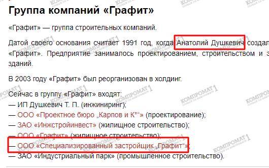 Judging by their patronymics, Anton and Artem Dushkevich are brothers. Their father, Anatoliy Dushkevich, headed the liquidated Management of Capital Construction Enterprise Grafit CJSC in 2012. The "Grafit" group of companies has been operating in the market since 1991.