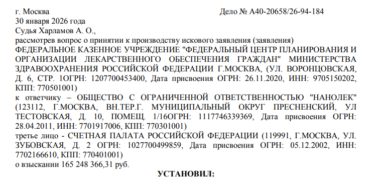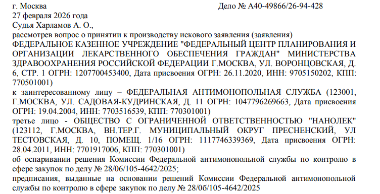 Сразу два знаковых дела разбирает арбитраж Москвы и в обоих случаях в качестве истца - Федеральный центр планирования и организации лекарственного обеспечения граждан Минздрава России, а третьим лицом ООО «Нанолек».
