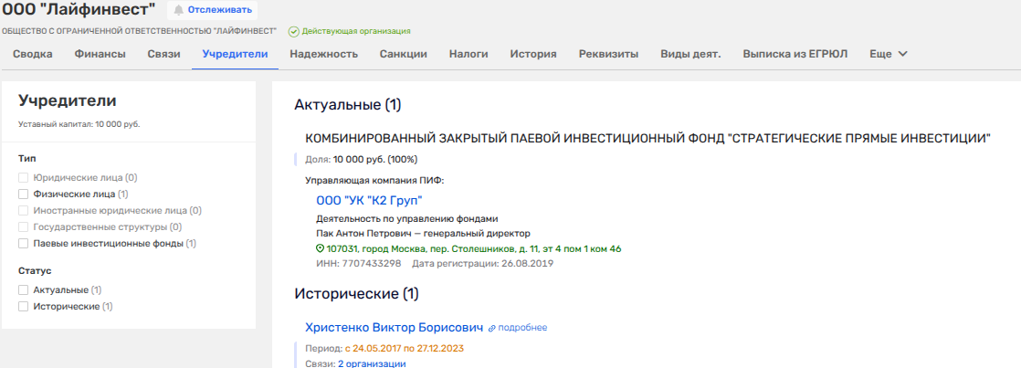 А уже к концу 2025 года оставшиеся 50% ЗПИФов перепали сыну партнера Харитонина Василию Кулькову и некоему Валерию Егорову.