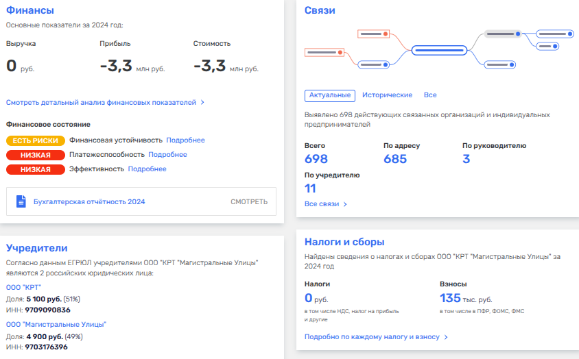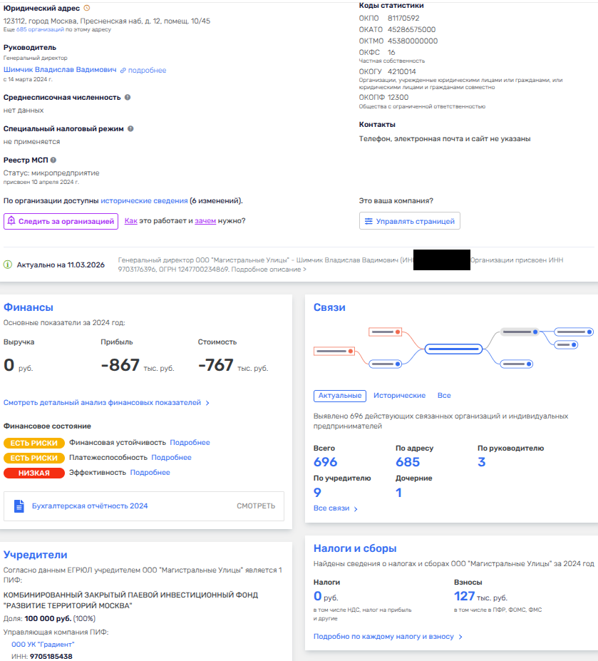 При этом владельцев ООО «Магистральные улицы», учрежденной словно бы специально под проект в 2024 году, прячут за ЗПИФ «Развитие территорий Москва» под управлением ООО УК «Градиент».