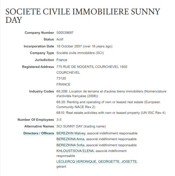 Например, на французскую SCI Sunny Day оформляется французская недвижимость семейства Березкиных. Фирма оформлена на Софию, Анну и Матвея Березкиных, а также некую KHLOUSTSOVA ELENA (супруга Березкина под девичьей фамилией). И у всех местом жительства указано Монако. Более того, тем же составом они владеют и фирмой SCI SNOWY DAY.