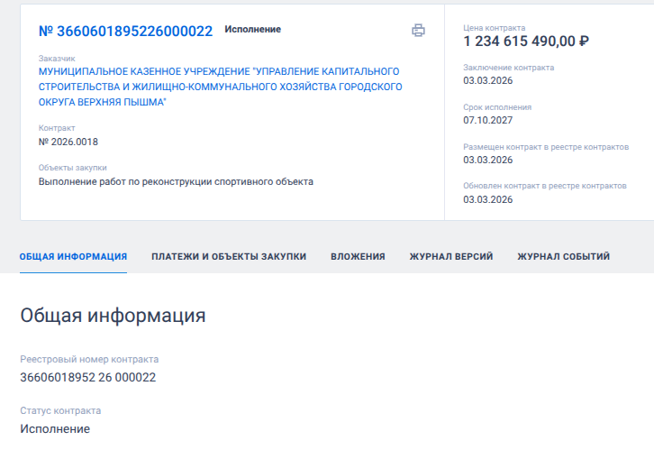 Еще 3 марта 2026 года управление капстроительства и ЖКХ г. Верхняя Пышма (Свердловская область) подмахнуло госконтракт на 1,234 млрд рублей.