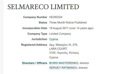 То же Selmareco Limited в открытых источниках до сих пор числится действующим, его директорами указаны BORIS MASTERENKO и SERGEY RATMANOV.