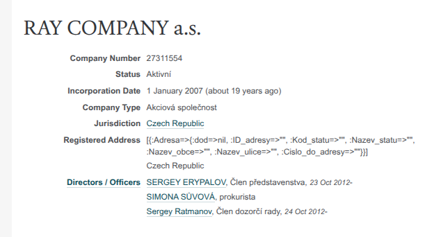 При этом ERYPALOV руководит и чешским KLOSS Engineering, где присутствует и его родственница - Elena Erypalova.