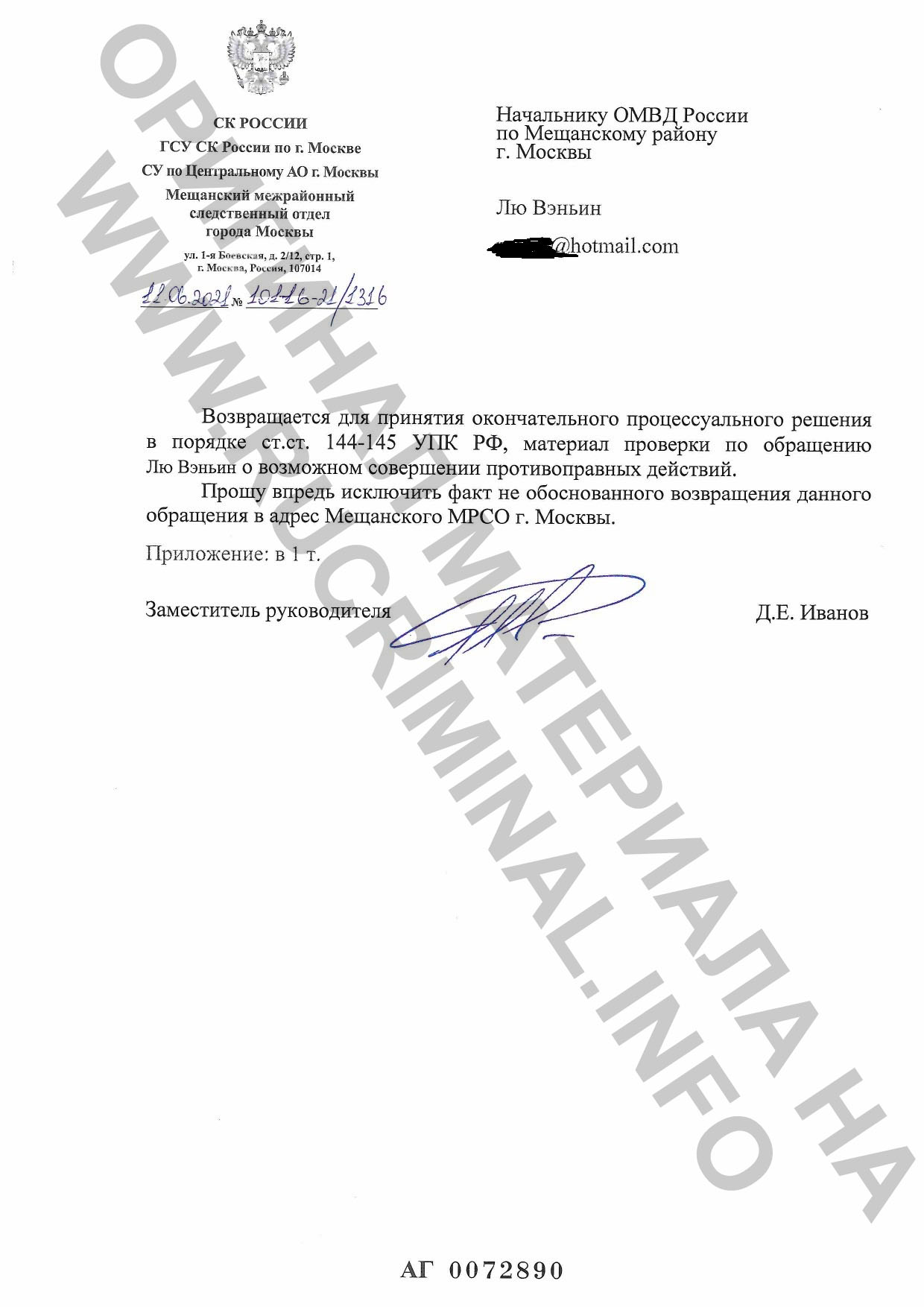В этой связи показательна история одной китайской пары, которая в 2021 году попыталась присоединиться к уголовному делу по ст. 159 УК п. 4 «мошенничество» против агентства Свитчайлд (№12001450016000560). Однако, за 10 дней до подписания незаконного и ничем не обоснованного постановления о прекращении уголовного дела следователем Мещанского СКР по г. Москве Катковой К.В., её начальник Тамбиев Марат Хамидович (с марта 2022 г. пребывающий в СИЗО за взятку в особо крупном размере) просто отфутболил (руками своего зама Иванова Д.Е.) заявление китаянки Лю Вэньин и её мужа в Мещанский ОВД (письма прилагаем), где оно благополучно и сгинуло, что нас совсем не удивляет. Потерпевшие написали десятки жалоб на это ОВД и заявлений об утрате доверия граждан, но бесполезно. В открытом доступе находятся свидетельства преступлений Свитчайлд ещё с 2013 года, когда обманутые клиенты ООО «Март» (бывшее юрлицо агентства «Свитчайлд») писали в интернете о подставных компаниях и их сливах вместе с миллионными предоплатами за программы сурматеринства, люди оставались без миллионных денег и детей. Как следует из отзыва, следствие проходило в Мещанском ОВД, значит, надзор вела Мещанская прокуратура. Столкнувшись с таким ничем не прикрытым саботажем нашего уголовного дела, нам стало предельно понятно, куда делось в том далеком 2013 году и это «расследование», и этот «надзор». Маски сброшены. Уголовные дела против банды Свитчайлд давят, годами оставляя беспомощных людей и детей в лапах мошенников.