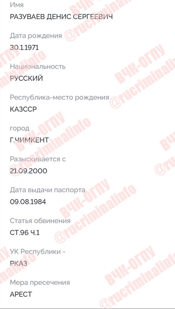 В архивных данных значится, что в 2000-х Денис Разуваев был в розыске. Силовики из Казахстана подозревали его в совершении убийства. В 2011 году он получил паспорт в Дагестане, основанием выдачи значилось «приобретение гражданства РФ». Другие члены семьи Разуваевых также легализовались в северо-кавказской республике.