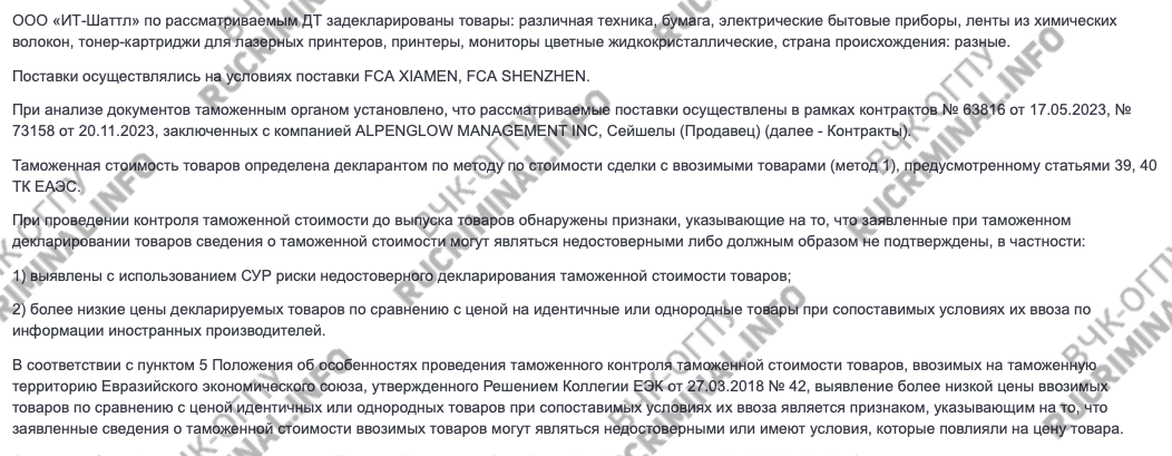 Торговля шла по сложной схеме: ALPENGLOW MANAGEMENT INC отправлял Тарасову персональный прайс-лист, цены в котором были установлены только для «ИТ-ШАТТЛа», затем стороны в личной переписке утрясали вопросы комплектации и объёмов, а потом Тарасов переводил деньги — но не сейшельскому офшору, а совершенно другой фирме. Товар на Московскую таможню приходил без половины положенных для импорта документов и по явно заниженной цене. Таможня в результате насчитывала дополнительные платежи на десятки миллионов рублей. В целом же Тарасов ввез не меньше сотни партий на несколько миллиардов рублей — к примеру, только по двум платежным поручениям в конце декабря 2023 года «ИТ-ШАТТЛ» перевела за поставки около 900 млн рублей некоей «Денали Корп-ФЗСО». Это фирма-кошелек в ОАЭ, которая имеет представительство в России — никакой деятельности она тут не ведёт и нужна исключительно для отмывания и вывода средств.